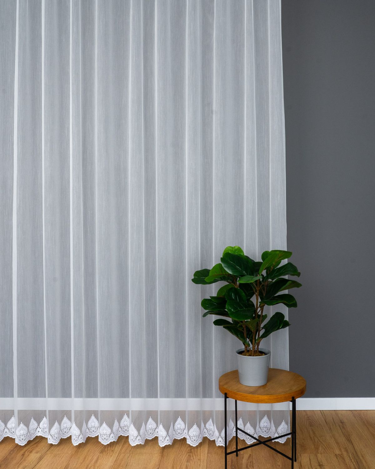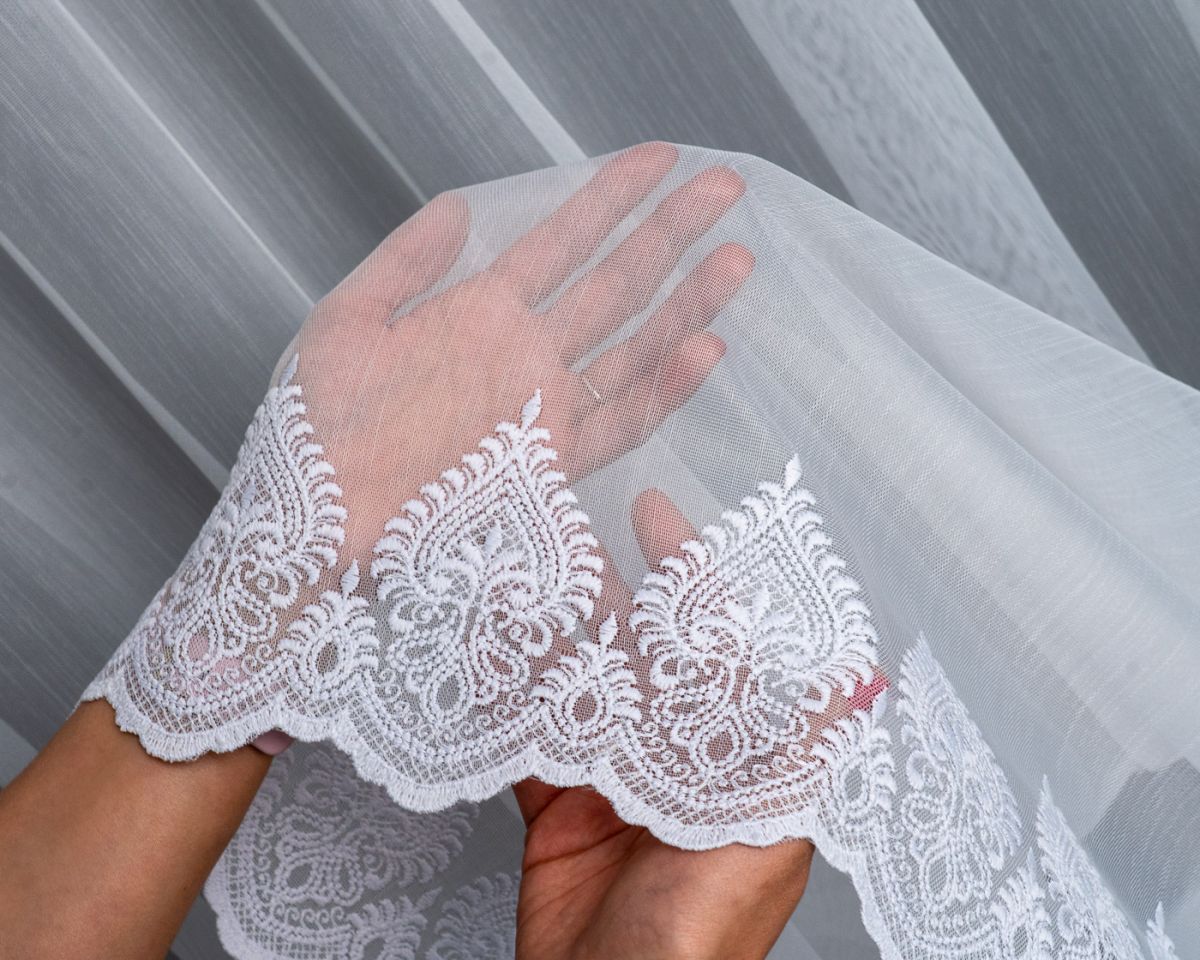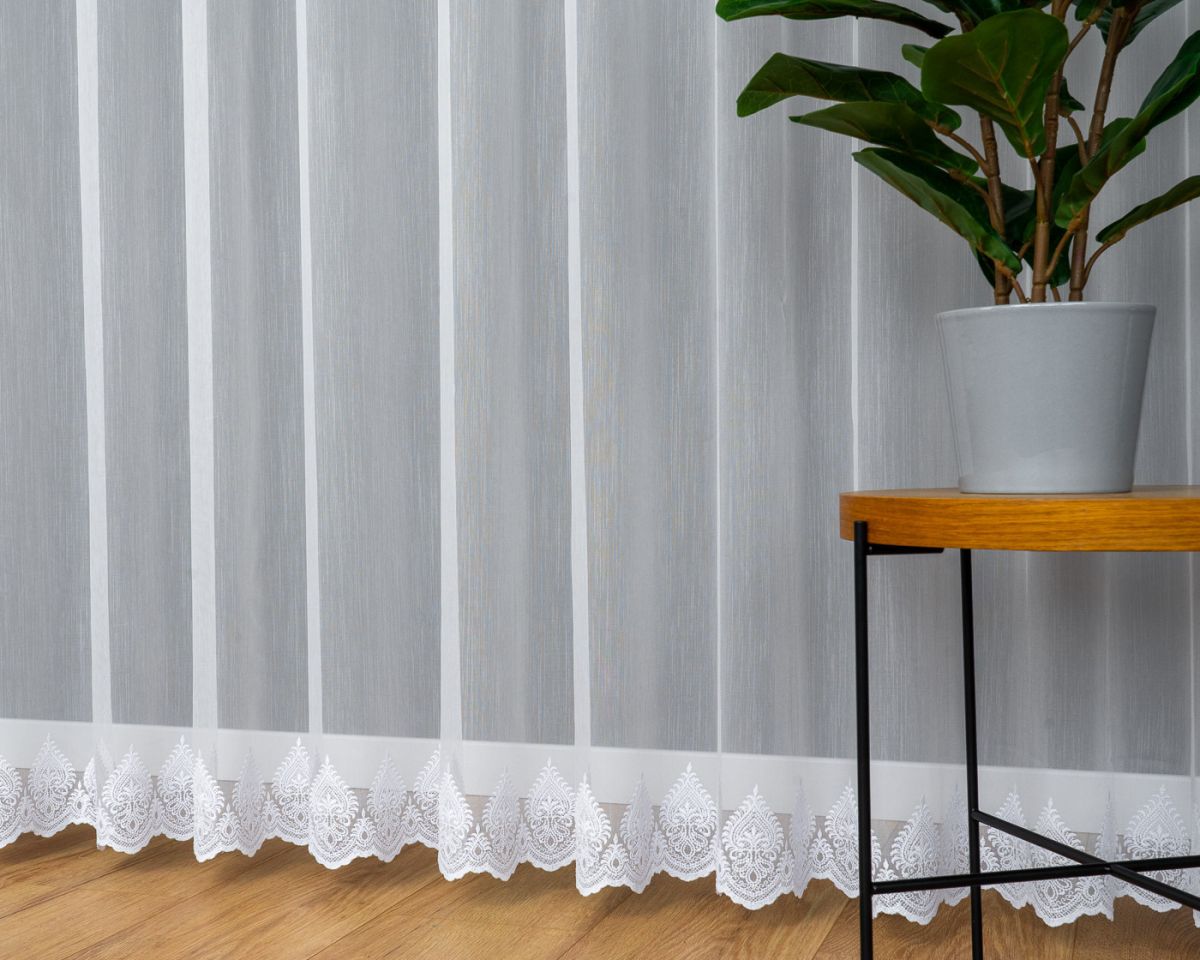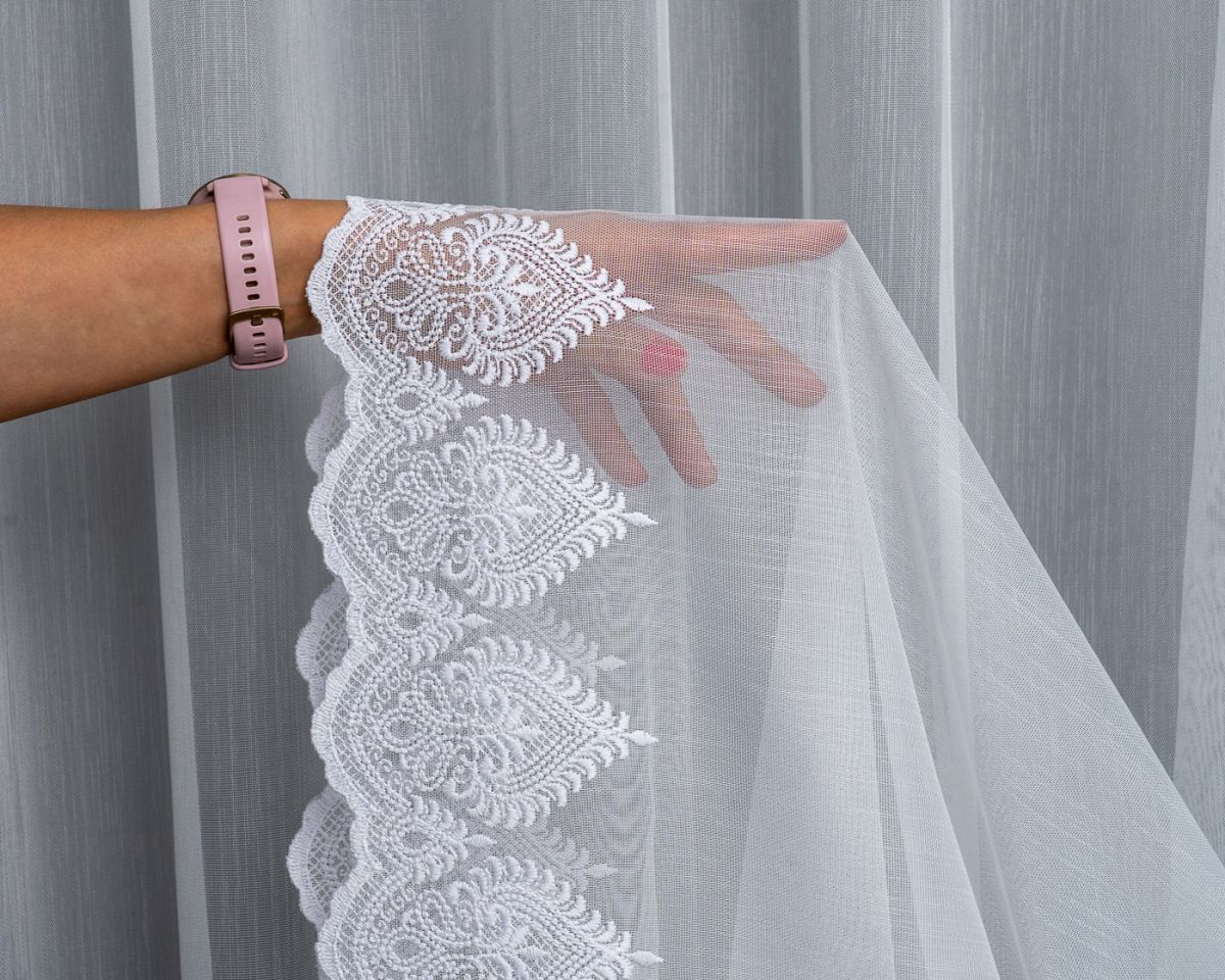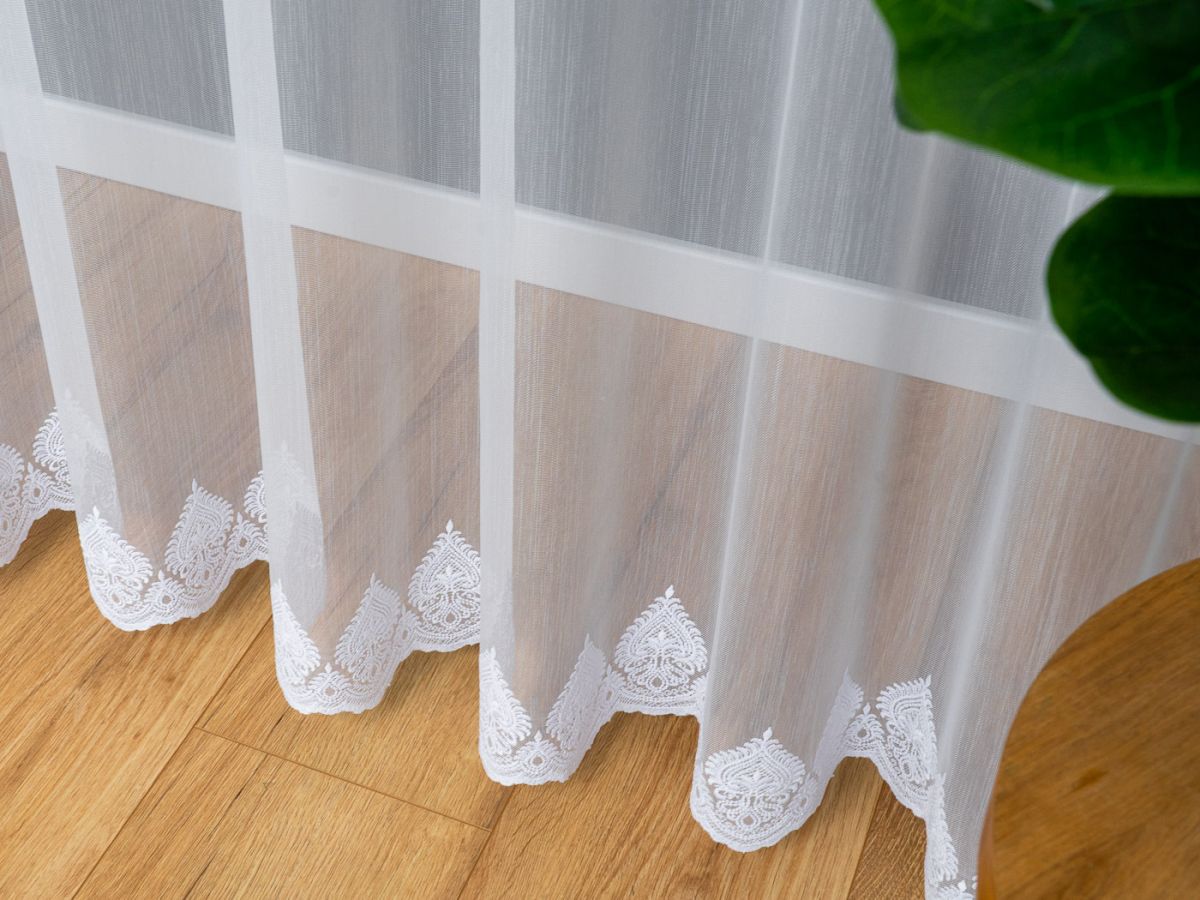 Zavjesa izvezena bijelim koncem. Moderna ukrasna tkanina, koja je glatka i ne zahtijeva glačanje. Zavjesa je ušivena na nabranu traku 1:2, što znači da će njena površina po širini biti upola manja nakon što se zavjese nabere.Skraćivanje zavjese uz doplatu 3,99 eura.