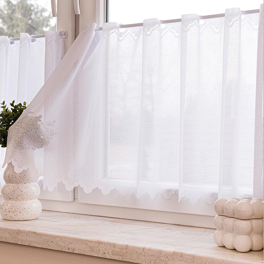 Moderna kuhinjska zavjesica koja dobro prekriva, namijenjena za kuhinjsku šipku. Spremna za vješanje.