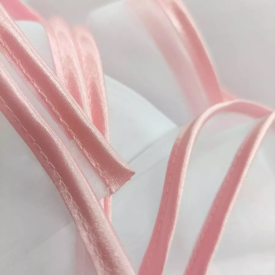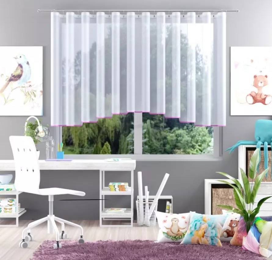 Zavjesa iz bijelog voala (ecru sa posebnom naruđbom). Dužine zavjesa obšivene ukrasnom trakom. Mogučnost odabira iz 100 boje ukrasne trake.
