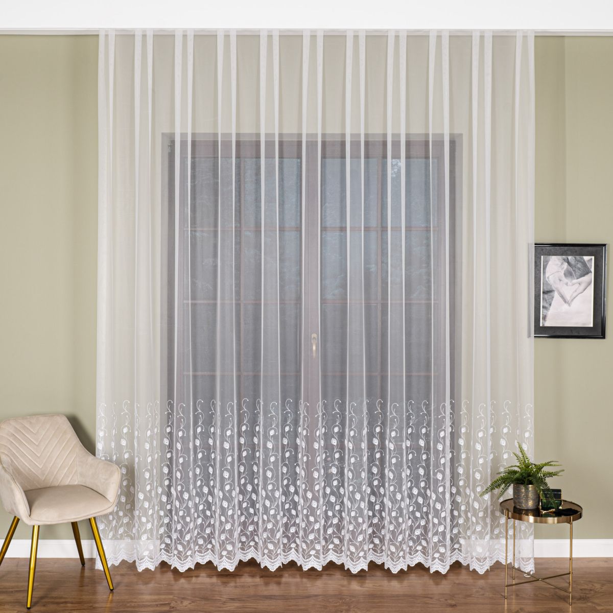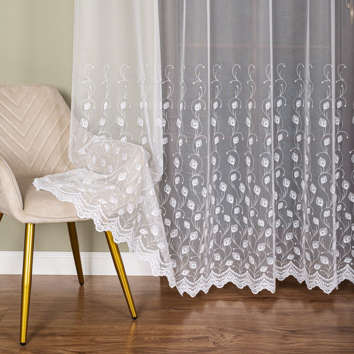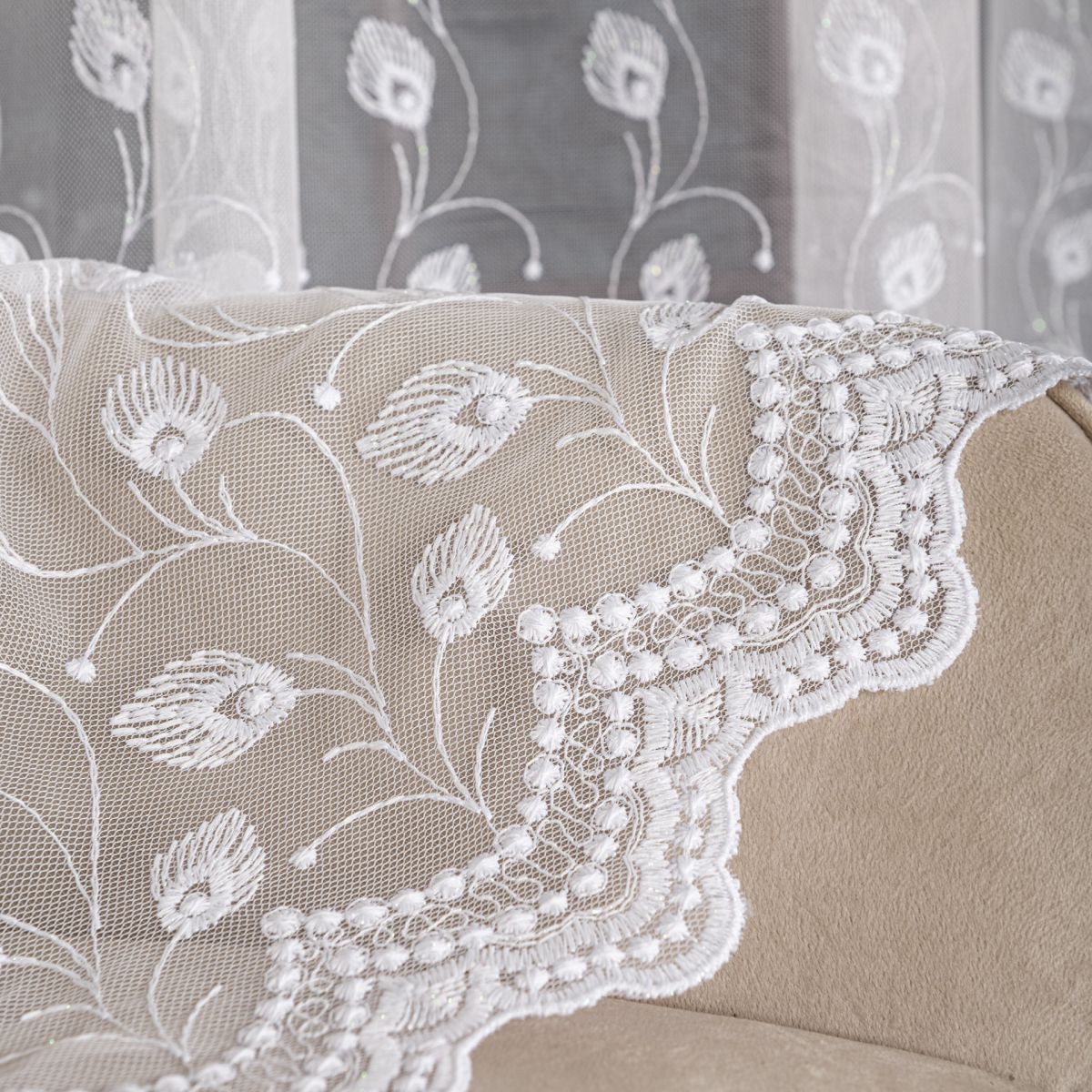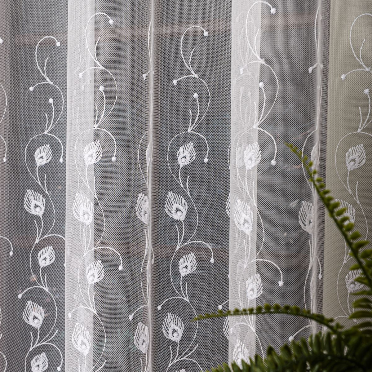 Zavjesa izvezena bijelim koncem. Moderna ukrasna tkanina, koja je glatka i ne zahtijeva glačanje. Zavjesa je ušivena na nabranu traku 1:2, što znači da će njena površina po širini biti upola manja nakon što se zavjese nabere.Skraćivanje zavjese uz doplatu 3,99 eura.